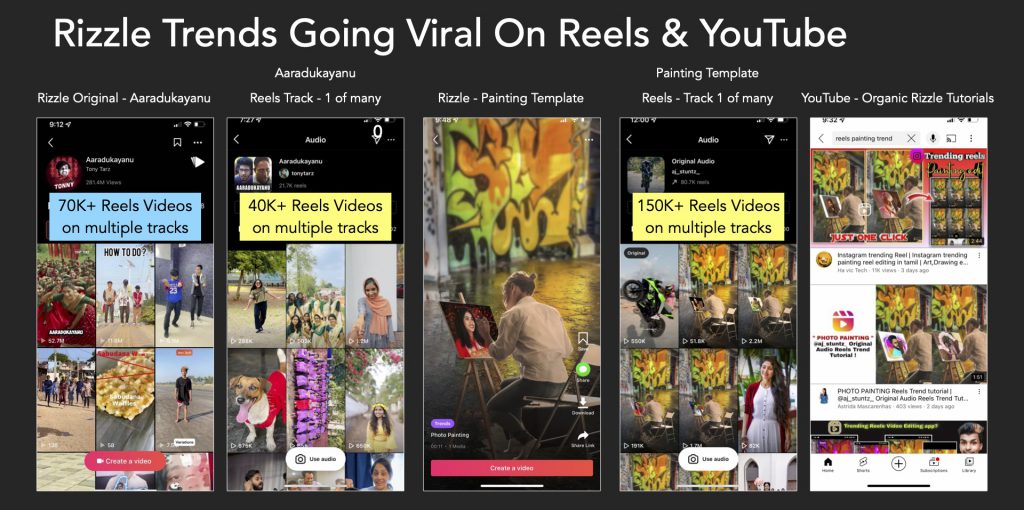 With over 300k Rizzle videos shared organically on Reels and YouTube, Rizzle Original Music Aaradukayanu, Rizzle Photo Painting Template, and Rizzle Tutorials continue to grow in popularity among content creators and users of all ages. Rizzle’s Photo Painting Template has been used to create over 150k short videos with millions of views. Aaradukaynu, Rizzle’s Original Music, on the other hand, has seen over 40k videos created on the app and over 70k videos created on Reels.