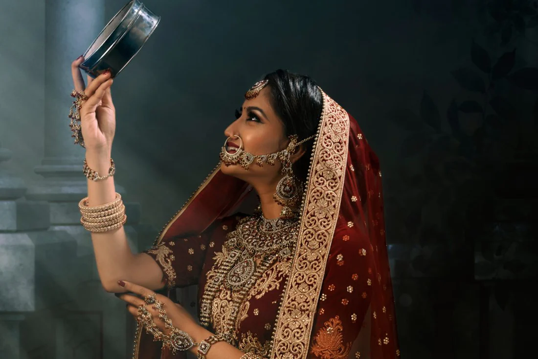 Ittar, the bridal perfume, and Gajra, a floral hair accessory with rose or jasmine, adorn the wife during Karwa Chauth ceremonies.