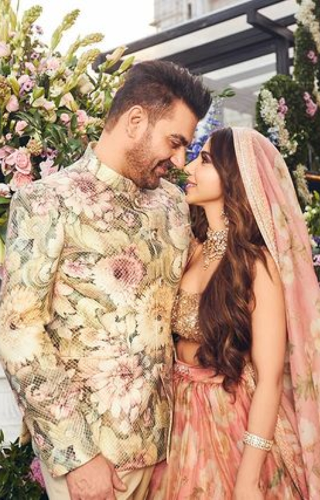 The couple were dressed in floral outfits, with groom in a bandhgala sherwani and bride in a pink pastel organza lehenga.