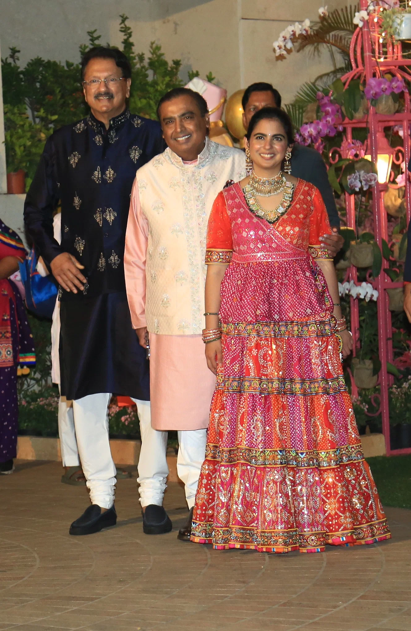 Isha, Mukesh Ambani, & Ajay Piramal were all smiles for the paps. Mukesh in a baby pink kurta-pyjama with a beige Nehru jacket, while Ajay chose a blue kurta-pyjama.