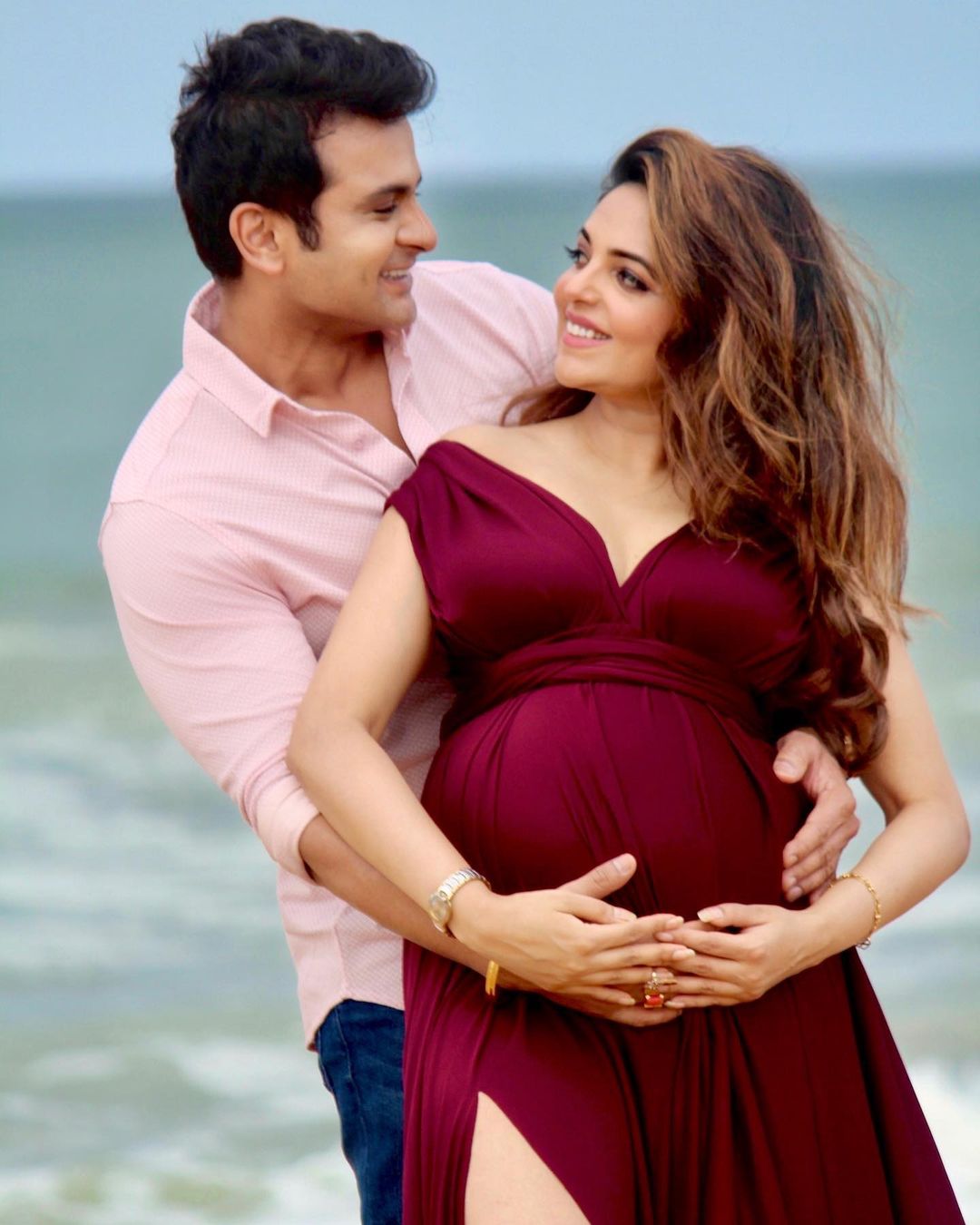 Sugandha dons an elegant maroon gown while Sanket opts for a charming light pink shirt, creating a picturesque maternity shoot.