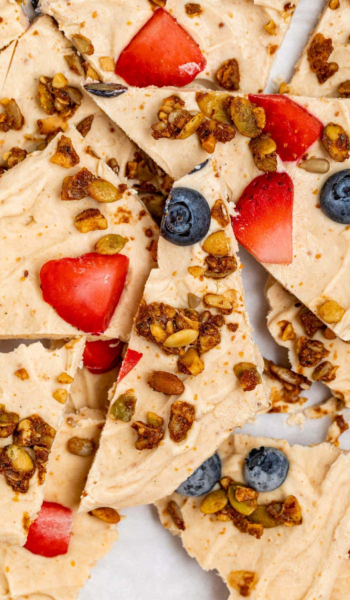 Spread Greek yogurt on a baking sheet, sprinkle with fruits, nuts, and a drizzle of honey. Freeze and break into pieces.
